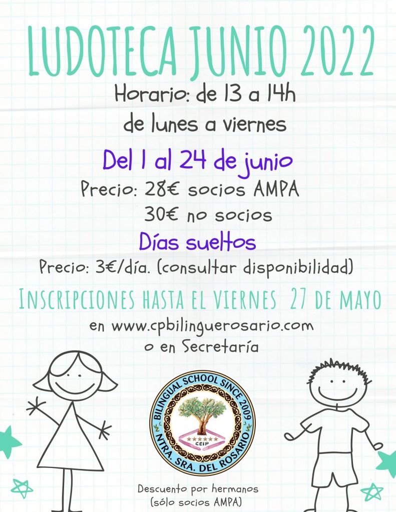 Este año, como novedad, el AMPA del colegio y la empresa IMAEDUCA ofrecen el servicio de ludoteca durante el mes de junio, para atender a los alumnos desde el fin de las clases hasta la recogida por parte de las familias. Horario: de lunes a viernes de 13 a 14h. Inscripciones abiertas hasta el viernes 27 de mayo.