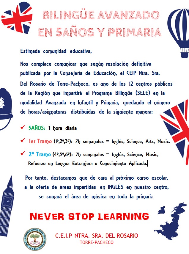 ¡Estamos de enhorabuena! Para el próximo curso escolar, nuestro centro será uno de los 12 centros públicos bilingües de toda la Región de Murcia, que impartirá el Sistema de Enseñanza en Lengua Extranjera (SELE) en nivel avanzado tanto en la Etapa de Infantil como en la de Primaria. Por ello, en el curso 2021-2022, el área de música se impartirá en inglés.
