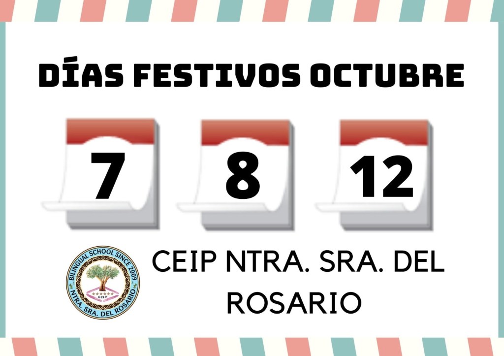 Recordamos que los próximos días 7 y 8, jueves y viernes respectivamente, el centro permanecerá cerrado por celebrarse las fiestas patronales de nuestro pueblo; asimismo, el próximo martes 12 no habrá clases por celebrarse la Fiesta Nacional de España.