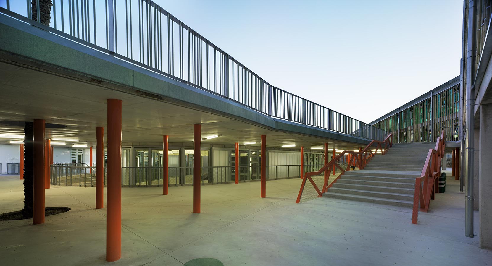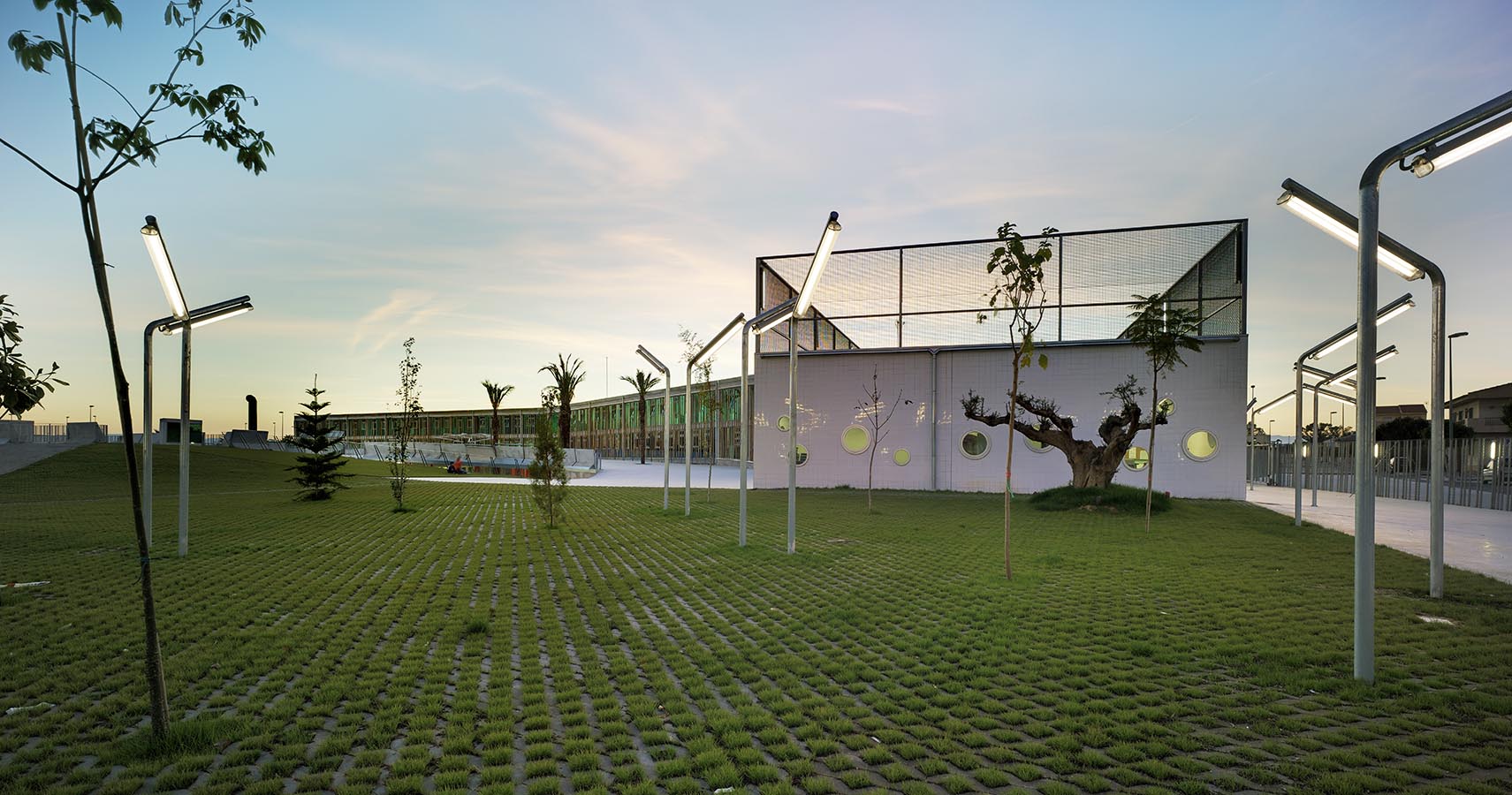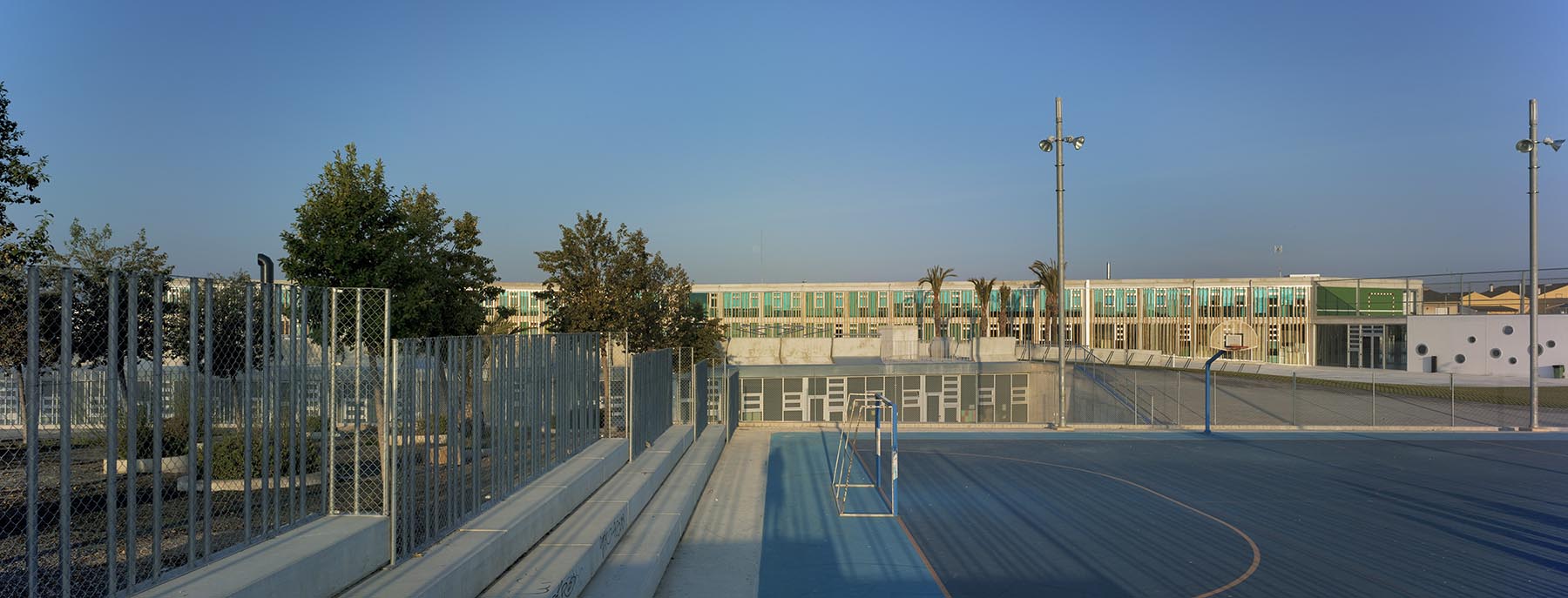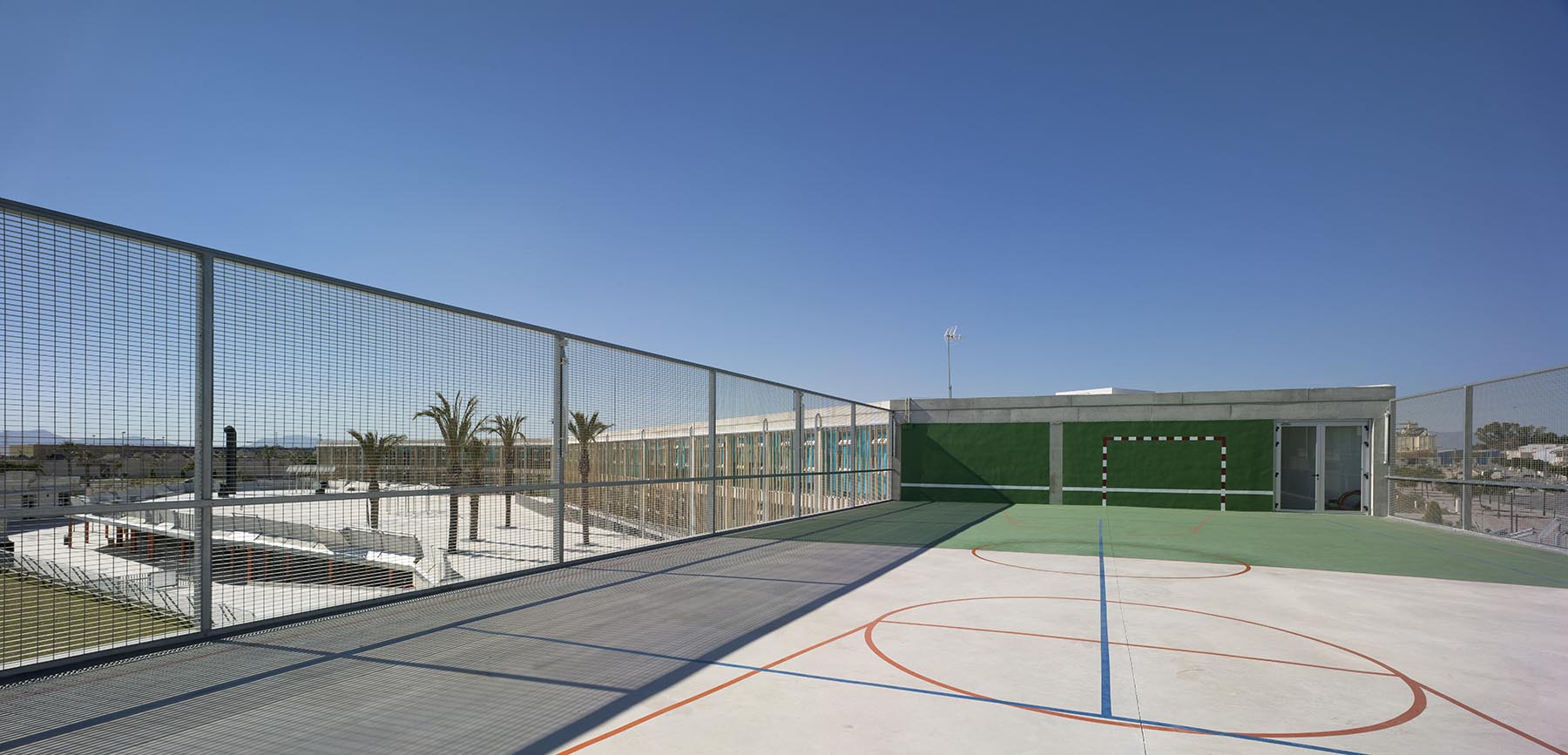 En la zona central del patio, hay un tercer edificio, de una planta, con una zona de recreo en la parte superior, donde se encuentran las dependencias de la cocina y comedor, con un aula de reposo, que este curso se utiliza también para compensatoria en horario lectivo. Además, en este edificio encontramos el Salón de Actos y se ha creado un aula de innovación, con todo el material de robótica, la impresora 3D, tabletas, chromebooks, panel digital, estudio croma, etc… Anexa al centro, podemos encontrar una pista deportiva con acceso directo desde el patio, de uso exclusivo del colegio en horario lectivo.